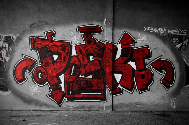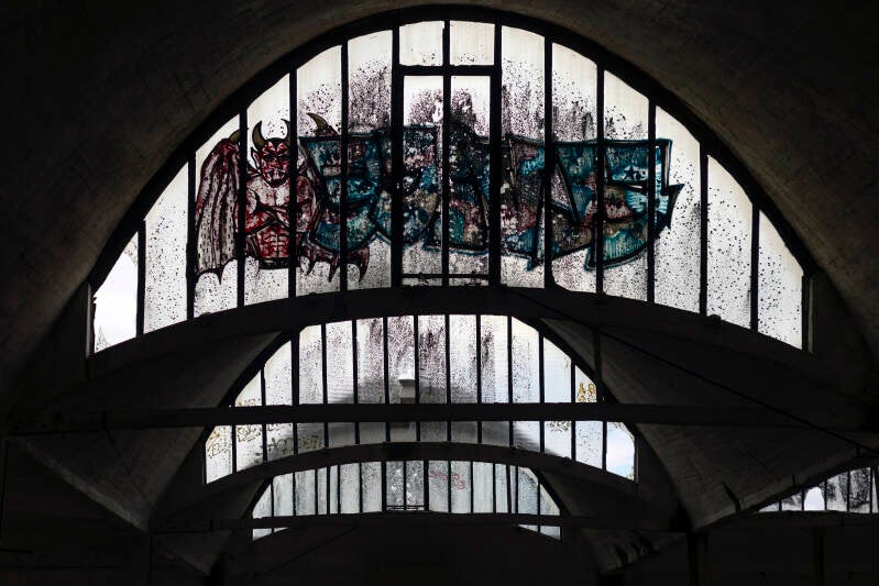 La lumière crée des jeux d'ombre au travers des fenêtres brisées qui ajoutent de la profondeur aux peintures murales. Les graffitis semblent animés.